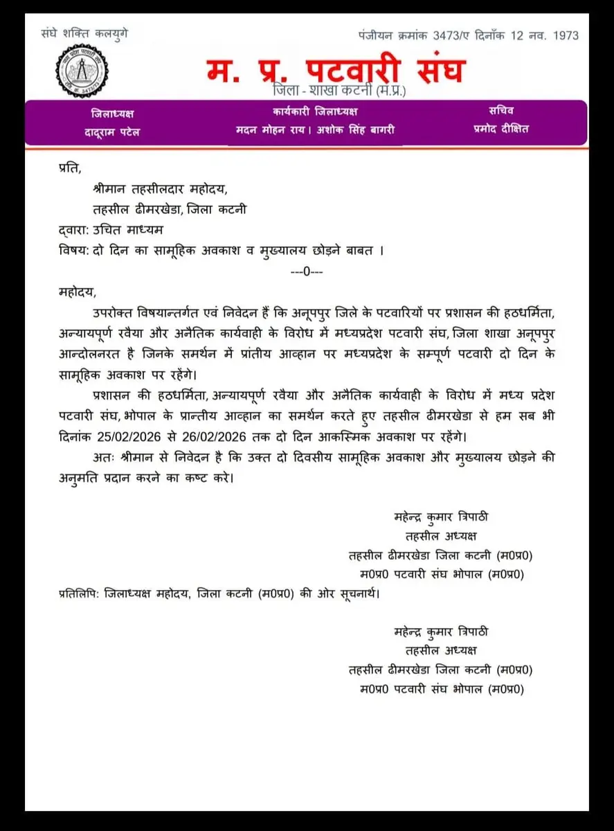 कटनी/ढीमरखेड़ा । अनूपपुर जिले में पटवारियों के साथ कथित अन्याय और प्रशासनिक कार्रवाई के विरोध में प्रदेशभर के पटवारियों ने एकजुटता दिखाई है। इसी क्रम में मध्यप्रदेश पटवारी संघ की जिला शाखाओं द्वारा 25 एवं 26 फरवरी 2026 को दो दिवसीय सामूहिक अवकाश का ऐलान किया गया है। इस निर्णय के चलते इन दो दिनों में राजस्व संबंधी कार्य प्रभावित रहेंगे और आमजन को असुविधा का सामना करना पड़ सकता है।प्राप्त जानकारी के अनुसार, अनूपपुर जिले में पटवारियों पर की जा रही कथित अनुचित कार्यवाही, प्रशासनिक दबाव और निलंबन जैसी कार्रवाइयों के विरोध में आंदोलन की शुरुआत हुई है। आंदोलन को प्रदेश स्तर पर समर्थन देते हुए मध्यप्रदेश पटवारी संघ ने दो दिन के सामूहिक अवकाश की घोषणा की है। इसी कड़ी में तहसील ढीमरखेड़ा, जिला कटनी के पटवारियों ने भी इस आंदोलन में सहभागिता जताई है। इस संबंध में मध्यप्रदेश पटवारी संघ, जिला शाखा कटनी द्वारा तहसीलदार ढीमरखेड़ा को पत्र प्रेषित कर 25/02/2026 से 26/02/2026 तक दो दिन के आकस्मिक सामूहिक अवकाश एवं मुख्यालय छोड़ने की अनुमति मांगी गई है। पत्र में उल्लेख किया गया है कि अनूपपुर जिले के पटवारियों के साथ प्रशासन द्वारा की जा रही कठोरता, अन्यायपूर्ण रवैये और अनैतिक कार्रवाई के विरोध में यह कदम उठाया जा रहा है। पत्र में यह भी कहा गया है कि यह आंदोलन प्रांतीय आह्वान पर किया जा रहा है और प्रदेश के समस्त पटवारी दो दिनों तक सामूहिक अवकाश पर रहेंगे। तहसील ढीमरखेड़ा के पटवारियों ने भी इस आह्वान का समर्थन करते हुए स्पष्ट किया है कि वे 25 और 26 फरवरी को कार्य से विरत रहेंगे। साथ ही संबंधित अधिकारियों से दो दिवसीय अवकाश स्वीकृत करने का अनुरोध किया गया है।