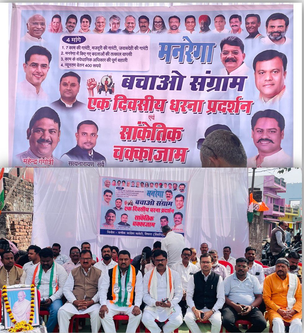 राष्ट्रपिता महात्मा गांधी जी के बलिदान दिवस के अवसर पर 30 जनवरी 2026 को श्रद्धांजलि अर्पित करते हुए “मनरेगा बचाओ संग्राम” के तहत पूर्व निर्धारित कार्यक्रम अनुसार ब्लॉक कांग्रेस कमेटी तिफरा द्वारा शांतिपूर्ण धरना/प्रदर्शन एवं प्रदेश के किसानों की धान खरीदी हेतु निर्धारित तिथि को बढ़ाए जाने की मांग को लेकर सांकेतिक चक्का जाम किया गया जिसमें मुख्य रूप से जिला कांग्रेस कमेटी बिलासपुर ग्रामीण के सम्माननीय अध्यक्ष श्री महेंद्र गंगोत्री जी उपस्थित रहे साथ ही इस कार्यक्रम हेतु जिला कांग्रेस कमेटी द्वारा नियुक्त समन्वयक श्री सुरेश ठाकुर जी एवं श्री बिहारी देवांगन जी भी उपस्थित रहें