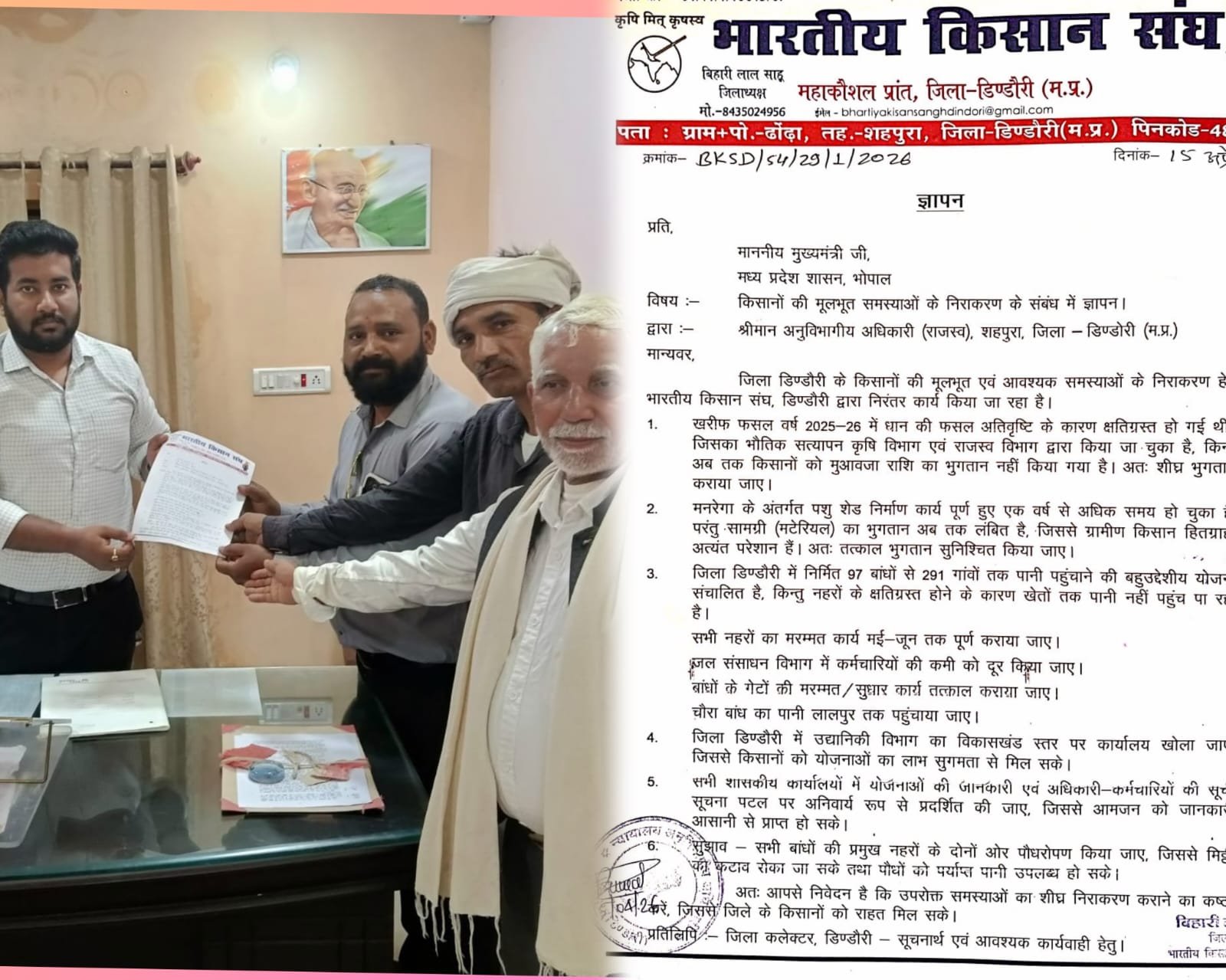 जिले के किसानों की मूलभूत समस्याओं के निराकरण को लेकर भारतीय किसान संघ, डिंडौरी द्वारा मुख्यमंत्री के नाम एक ज्ञापन सौंपा गया। यह ज्ञापन अनुविभागीय अधिकारी (राजस्व) शहपुरा के माध्यम से प्रेषित किया गया, जिसमें किसानों से जुड़े कई अहम मुद्दों को प्रमुखता से उठाया गया है।