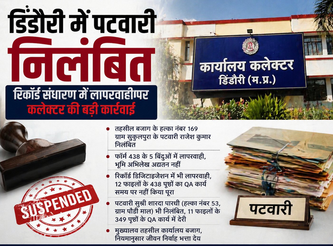 रिकॉर्ड संधारण में लापरवाही पड़ी भारी: डिंडौरी में दो पटवारी निलंबित, कलेक्टर की सख्त कार्यवाही