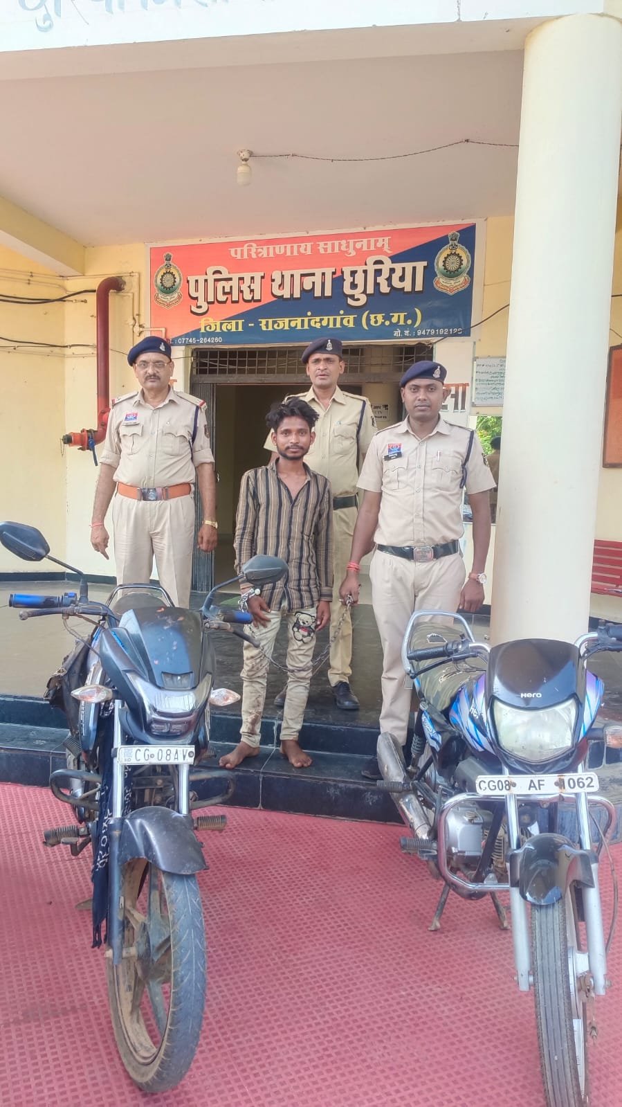 राजनांदगाव /थाना धुरिया के अपराध क्रमांक 42/2026 पारा 303(2) बीएनएस एंव 75/2026 बारा 303(2) बीएनएस के मामले में अज्ञात आरोपी के खिलाफ अपराध कायम कर विवेचना में लिया गया था विवेचना के दौरान दिनांक 16.04.2026 को मुखचीर सूचना से प्राप्त हुआ की एक व्यक्ति बस स्टैण्ड छुरिया के पास कम कीमत पर मोटर सायकल बेचने के लिए ग्राहक की तलाश करने की सूचना प्राप्त होने पर मुखबीर सूचना की तस्दीक हेतू गवाह तलब कर छुरिया द्वारा बस स्टैण्ड के पास पहुंच कर मुखबीर द्वारा बताये हुलिये के व्यक्ति दिखने पर खेराबंदी कर पकड कर उसके नाम पता पुछने पर मुलंचद सिन्हा उर्फ रवि पिता संतोष उम्र 26 साल निवासी मोहबा पुलिस चौकी चिखली थाना कोतवाली जिला राजनांदगांव का रहने वाला बताया व अपने मेमोरेण्डम कथन में बताया की यह दिनांक 02.03. 2026 को ग्राम बोईरडीह रोड किनारे खड़ी हुई मोटर सायकल एच०एफ डीलक्स सीजी 08 यु 5793 को चोरी कर चलाते ले जा रहा था मो०सा० में पेट्रोल खत्म होने पर उस मो०सा० को छुरिया चिचोला रोड बापुटीला चौक के पहले पेड़ के निचे रखना तथा दिनांक 05.04.2026 को शासकीय शराब भटटी चंदैनिडीह के चखना दुकान के सामने खड़ी मोटर सायकल मो०सा० एच०एफ डीलक्स क्रमांक सीजी 08 ए एफ 1062 को चोरी करना मोटर सायकल ले जाते समय पेट्रोल खत्म होने पर गौरी नाला पुलिया के पास झाडीयो में छिपा कर रखने का कथन देने पर आरोपी मुलंचद सिन्हा उर्फ रवि पिता संतोष उम्र 26 साल निवासी मोहबा पुलिस चौकी चिखली के निशांनदेही में मोटर सायकल को दिनांक 16.04.2026 को जप्त किया जाकर विधिवत कार्यवाही कर आरोपी गिरफतार कर न्यायिक अभिरक्षा में भेजा गया है। उक्त कार्यवाही में निरीक्षक कौशलेश देवांगन, सउिन उदय सिंह चंदेल, प्रआर0 1335 मनोज कुमार साहू आर0 160 देवीलाल साहू, आर0 460 फूलेन्द्र राजपूत की सराहनीय भूमिका रही।