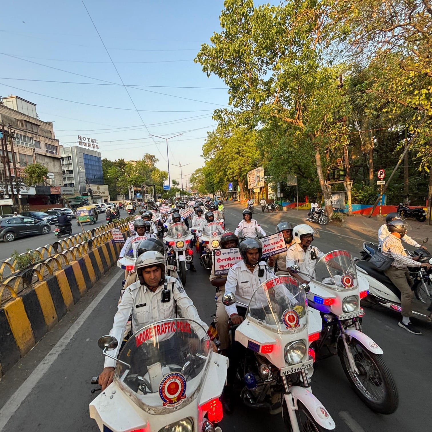 यातायात प्रबंधन पुलिस ने हेलमेट बाइक रैली का आयोजन पुलिस आयुक्त, नगर इंदौर संतोष कुमार सिंह ने रैली में सम्मिलित सभी लोगों को सड़क सुरक्षा – जीवन रक्षा के लिए सदैव नियमों का पालन करने व दूसरों को भी सड़क सुरक्षा नियमों के पालन की अपील करते हुए पुलिस कमिश्नर ने हेलमेट जागरूक रैली को हरी झंडी दिखाकर रवाना किया गया,, बाइक रैली पलासिया चौराहा घण्टाघर, रीगल सर्कल होते हुए राजवाड़ा पर पहुँची। बाइकर्स ने पंपलेट एवं तख्तियों के माध्यम से अन्य वाहन चालकों को संदेश दिया दो पहिया पर हो सवार तो हेलमेट पहने, चार पहिया में सवार हो तो सीट बेल्ट लगाए, तेज गति से वाहन न चलाये, अनावश्यक हॉर्न नहीं बजायें, रेड लाइट का पालन करें, वाहन चलाते मोबाइल फोन का इस्तेमाल नहीं करे ,,डीसीपी, यातायात त्रिपाठी ने हेलमेट बाइक रैली को सफल बनाने के लिए सभी जिम्मेदार प्रतिभागियों की सराहना की रैली में यातायात अतिरिक्त पुलिस उपायुक्त संतोष कुमार कौल, अतिरिक्त पुलिस उपायुक्त नरेश अन्नोटिया, अतिरिक्त पुलिस उपायुक्त अमरेंद्र सिंह, यातायात के सभी सहायक पुलिस आयुक्त, थाना प्रभारी यातायात सहित इन्दौर पुलिस, यातायात प्रबंधन पुलिस के अधिकारी/कर्मचारी के साथ-साथ ट्रैफिक प्रहरी, बाईकर्स, एनजीओ के जिम्मेदार नागरिक सम्मिलित हुए।