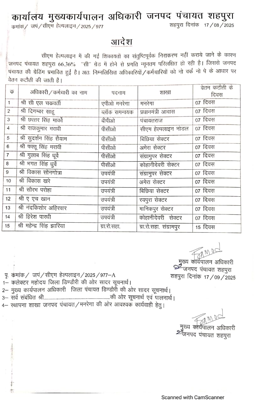 “सीएम हेल्पलाइन में लापरवाही – शहपुरा जनपद के 15 अफसर-कर्मचारियों का वेतन कटा”