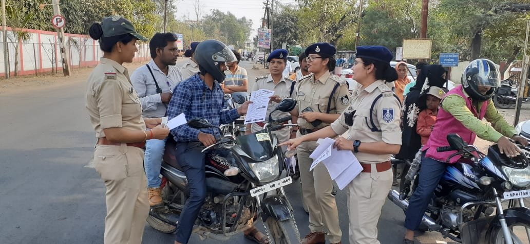 महिला दिवस के उपलक्ष पर सोमवार को हरदा जिले की महिला पुलिस ने घंटाघर चौराहा एवं बाईपास चौराहा पर महिला पुलिस बल तैनात रहा इस दौरान उन्होंने लोगों से यातायात नियमों का पालन करने की अपील की और कहा कि सभी को यातायात नियमों का पालन करना चाहिए। क्रमबद्ध तरीके से सभी ट्रैफिक नियम बताएं इस दौरान महिला पुलिस ने यातायात व्यवस्था की कमान संभाली सड़क से निकल रहे सभी लोगों को रोककर वाहन चालकों को रोक कर यातायात नियमों का पालन करने की समझाइश दी यातायात के नियम पालन करवाने के लिए पेमपलेट देकर अपील की। उन्होंने कहा कि दोपहिया वाहन चालक बिना हेलमेट के वाहन ना चलाए वाहन चलाते समय मोबाइल फोन का उपयोग ना करें आवश्यक हो तभी मोबाइल फोन का उपयोग करें चार पहिया वाहन चालक सीट बेल्ट अवश्य लगाएं कोई भी शराब पीकर वाहन न चलाएं इस प्रकार की अपील की गई इस दौरान कुछ वाहन चालकों के चालान भी बनाए गए।