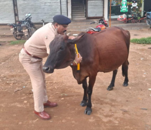 सड़क दुर्घटनाओं की रोकथाम हेतु धमतरी पुलिस की अभिनव पहल – आवारा मवेशियों को पहनाए जा रहे रेडियम रिफ्लेक्टर बेल्ट