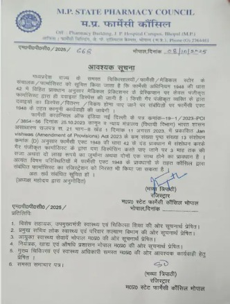 मेडिकल स्टोर पर फार्मासिस्ट का रहना अनिवार्य, 21 बच्चों की मौत के बाद फार्मेसी काउंसिल ने जारी किया नोटिस, बिना फार्मासिस्ट के दवा बिक्री पर रोक, मेडिकल स्टोर को निर्देश बिना प्रिस्क्रिप्शन दवा ना दें, गैर-पंजीकृत व्यक्ति को दवा के वितरण, बिक्री की अनुमति नहीं।कमी मिली तो लाइसेंस निरस्त होगा। छिंदवाड़ा में डाक्टर की पत्नी और भतीजा चला रहे थे मेडिकल स्टोर, उसी मेडिकल स्टोर में बिक रही थी प्रतिबंधित कफ सिरप। ब्यूरो छिंदवाड़ा पुलिसवाला