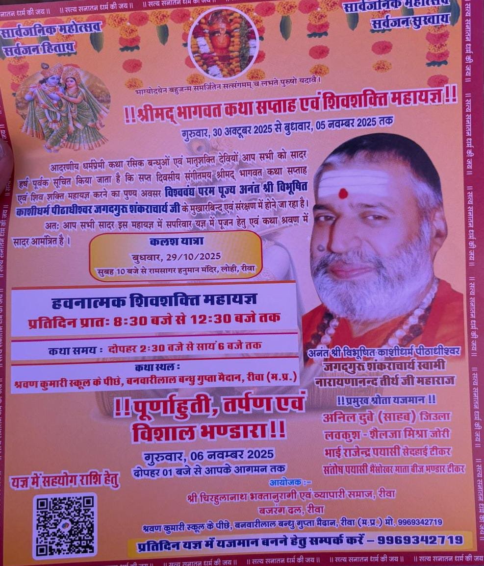 एक रहना सनातन की प्राचीन परंपरा: सात दिवसीय कथा में रीवा पहुंचे काशी पीठाधीश्वर नारायणनंद सनातनियों से एक रहने की करी अपील