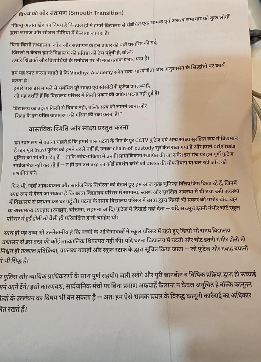जिनसे स्पष्ट होता है कि परिसर में कोई अप्रिय घटना नहीं हुई।विद्यालय प्राचार्य ने बताया कि छात्रा पूरी तरह स्वस्थ अवस्था में विद्यालय से घर गई थी। साथ ही अभिभावकों द्वारा उस समय किसी भी प्रकार की शिकायत नहीं की गई थी। प्रबंधन ने कहा कि संस्था शिक्षा, अनुशासन और संस्कारों के प्रति समर्पित है