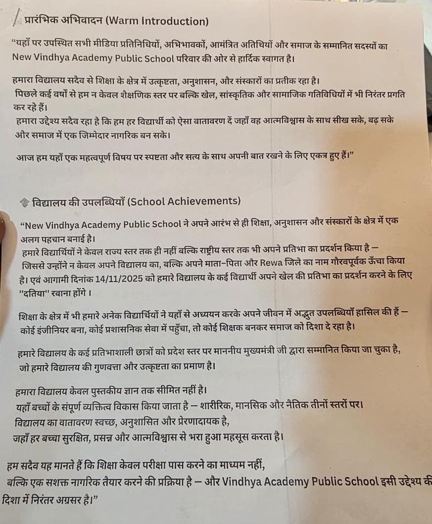 रीवा के चिरहुला कालोनी स्थित न्यू विंध्य एकेडमी पब्लिक स्कूल के प्राचार्य राजपाल सिंह ने पत्रकारों से चर्चा करते हुए कहा कि हाल ही में सोशल मीडिया पर प्रसारित भ्रामक खबरों को पूरी तरह असत्य और निराधार बताया है। विद्यालय प्रबंधन ने कहा कि घटना से संबंधित सभी साक्ष्य और सीसीटीवी फुटेज पुलिस को सौंप दिए गए हैं,