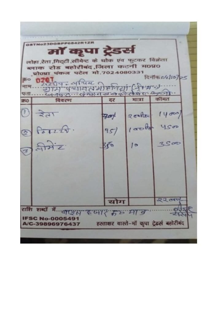 कटनी | कटनी जिले की बहोरीबंद जनपद पंचायत अंतर्गत ग्राम पंचायत मुहनिया नीम में भ्रष्टाचार और फर्जीवाड़े का मामला उजागर हुआ है।पंचायत में जारी किए जा रहे बिलों में बड़े स्तर पर गड़बड़ी सामने आई है, जिसमें मां कृपा ट्रेडर्स बहोरीबंद की सीधी भागीदारी बताई जा रही है।पंचायत स्तर पर जारी बिलों में अलग–अलग दरों पर एक ही सामग्री का भुगतान दिखाया गया है, जिससे पूरे मामले पर गंभीर सवाल खड़े हो गए हैं।