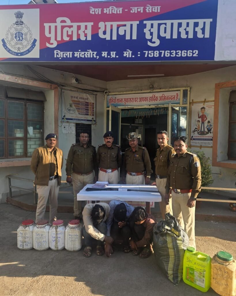 पुलिस अधीक्षक मंदसौर श्रीमान विनोद कुमार मीना के द्वारा सम्पत्ति संबंधी अपराधो की रोकथाम हेतु व सम्पत्ति संबंधी अपराधो की पतारसी हेतु व अवैध शराब की तस्करी करने वाले अपराधियो पर प्रभावी कार्यवाही करने हेतु चलाये जा रहे विशेष अभियान के तहत समस्त थाना प्रभारी को प्रभावी कार्यवाही करने के निर्देश दिये थे जिसके तारतम्य मे दिनांक 04.12.2025 को श्रीमान अतिरिक्त पुलिस अधीक्षक गरोठ सुश्री हेमलता कुरील , एस.डी.ओ.पी. सीतामऊ श्री दिनेश प्रजापति के निर्देशन मे थाना प्रभारी सुवासरा निरीक्षक अनिल रघुवंशी के मार्गदर्शन मे उप निरीक्षक केरूसिंह रावत के द्वारा विश्वसनीय मूखबिर सूचना के आधार पर तालाब के पास जंगल ग्राम रावतखेड़ा से आरोपीगण कृपालसिंह उर्फ लम्बु पिता जतनिया कंजर उम्र 30 साल निवासी मुण्डला डेरा थाना गंगधार जिला झालावाड़ , जरनिया पिता भगवान कंजर उम्र 25 साल निवासी मुण्डला डेरा थाना गंगधार जिला झालावाड़, बंटी पिता दाणु कंजर उम्र 21 साल निवासी मुण्डला डेरा थाना गंगधार जिला झालावाड़ के कब्जे से 06 प्लास्टिक की केन मे भरी कुल 60 लीटर हाथ भट्टी की जहरीली कच्ची शराब जप्त कर आरोपीयो को गिरफ्तार किया गया व आरोपीयो के विरूद्ध अपराध पंजीबद्ध कर विवेचना मे लिया गया ।