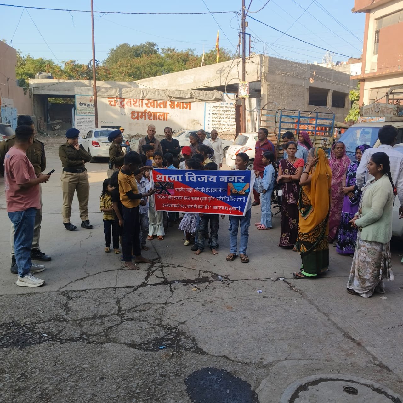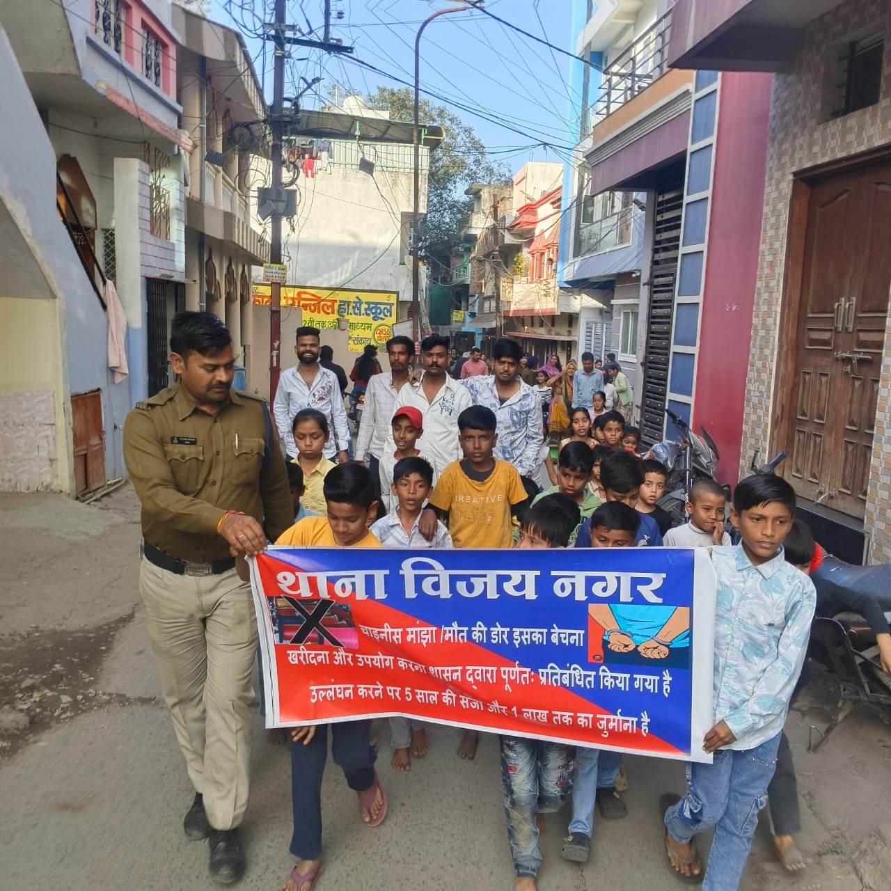 पुलिस थाना विजय नगर रामनगर बड़ी भमोरी व सयाजी चौराहे पर लोगों को चाइनीज़ मांझे पर प्रतिबंध व इसका उपयोग न करने के प्रति जागरूक किया। और स्थानीय लोगों व बच्चों के साथ हाथों में तख्तियां लिए एक रैली निकाली लोगों को चाइनीज़ मांझा के खतरनाक प्रभावों के बारे में पूर्ण से जानकारी दी गई।