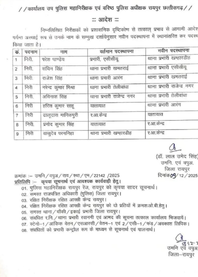 रायपुर पुलिस विभाग में बड़ा फेरबदल: देर रात 5 थाना प्रभारियों समेत ACCU प्रभारी का तबादला