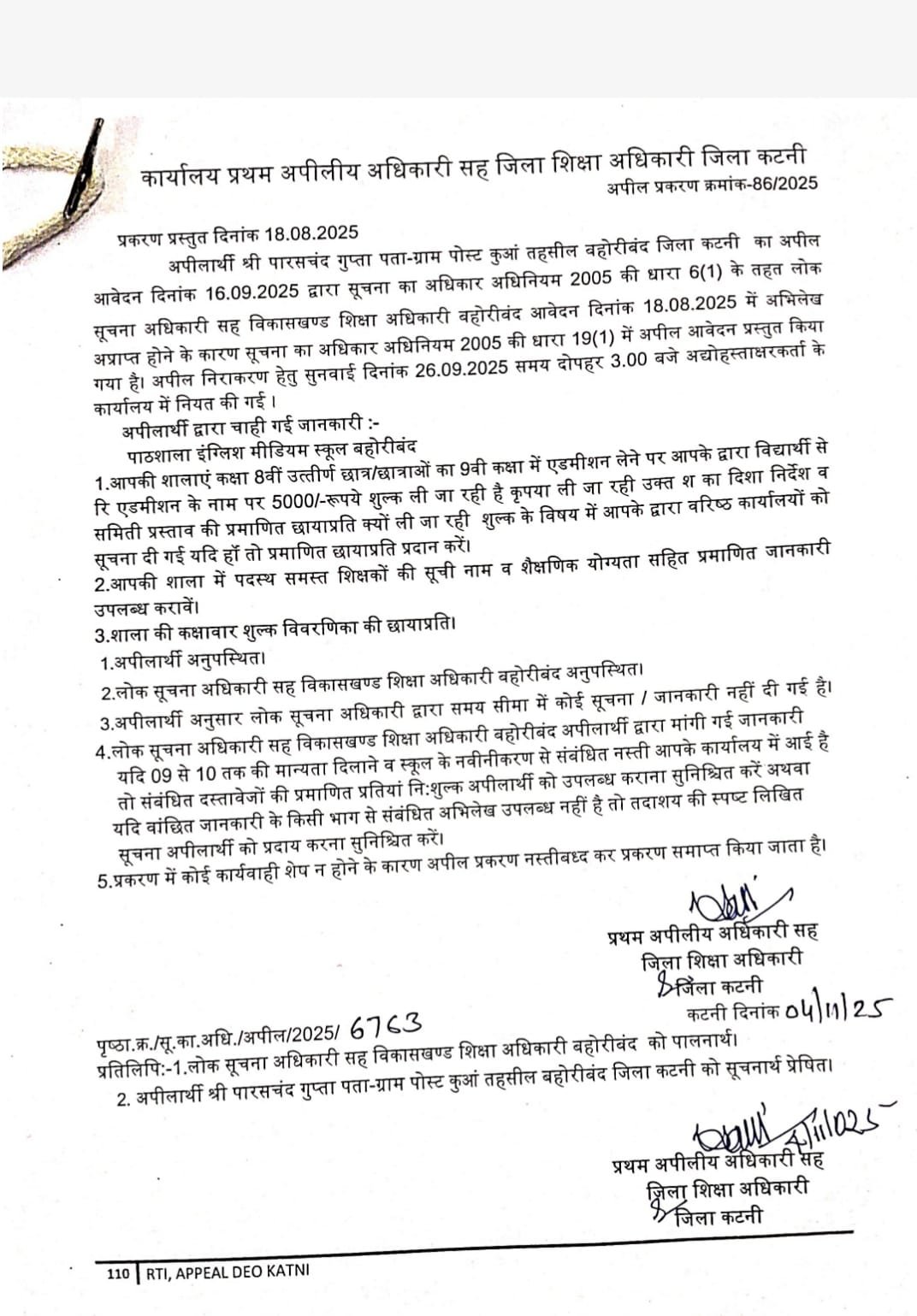 सूचना न देने के कारण आवेदक ने 18 अगस्त 2025 को प्रथम अपील दायर की । मामले की सुनवाई 26 सितंबर 2025 को हुई, जिसमें प्रथम अपीलीय अधिकारी सह जिला शिक्षा अधिकारी कटनी ने स्पष्ट निर्देश जारी किए। अपीलीय अधिकारी ने कहा बीईओ बहोरीबंद द्वारा मांगी गई सूचना उपलब्ध न कराना सूचना का अधिकार अधिनियम 2005 का सीधा उल्लंघन है। स्कूल में अवैध शुल्क वसूली की शिकायत के बावजूद कोई रिपोर्ट या कार्रवाई नहीं करना गंभीर लापरवाही है।8 वीं से 10 वीं तक स्कूल की मान्यता, शिक्षक सूची तथा शिकायतों पर की गई कार्रवाई की प्रमाणित प्रतियां नि:शुल्क उपलब्ध कराई जाएं। यदि कोई सूचना उपलब्ध नहीं है, तो उसका स्पष्ट उल्लेख लिखित में किया जाए, जिला शिक्षा अधिकारी कार्यालय से विकासखंड शिक्षा अधिकारी कार्यालय को जानकारी उपलब्ध कराए जाने का आदेश करते हुए सूचना अधिकार प्रकरण निराकृत किया गया किंतु विकासखंड शिक्षा अधिकारी बहोरीबंद के द्वारा आज दिनांक तक जिला शिक्षा अधिकारी के आदेश पालन में न्याय संगत कार्यवाही नहीं की गई और ना ही आदेश का पालन किया गया