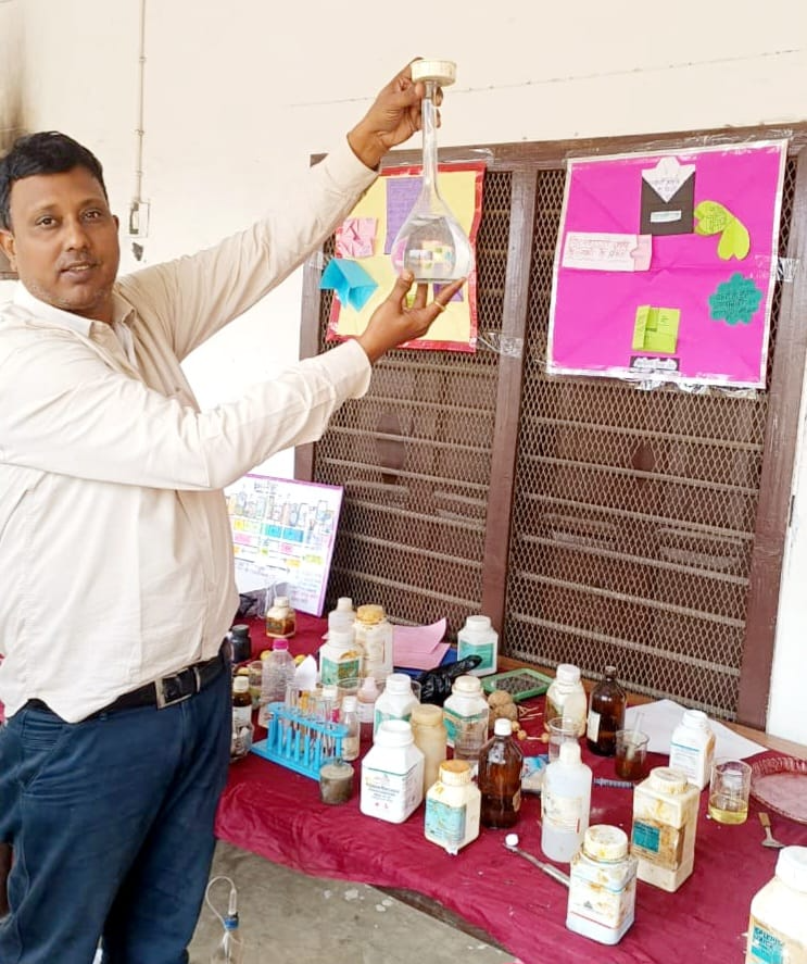जिला समन्वयक अश्वनी कुमार जैन ने अपने टीएलएम आधारित मॉडल की निर्णायक मंडल के समक्ष प्रस्तुति प्रदान करते हुए रसायन विज्ञान के चमत्कार प्रस्तुत करते हुए विभिन्न प्रयोगों को समझाया। उन्होंने अपने विज्ञान के चमत्कारों में सर्वप्रथम हल्दी से सिंदूर बनाकर तिलक लगाना, कागज़ पर बिना स्याही के लिखना, हल्दी से सिन्दूर बनाना, नीले रंग का हरे रंग में परिवर्तन, नाचती जादुई गोलियां, ढूंढों अम्ल एवं क्षारक को, विसरण क्रिया, कार्बनिक यौगिको की संरचना, शरीर पर चाकू से घाव करना, अमोनिया का परीक्षण, नीबू से खून निकालना, अदृश्य लिखावट, एसीटेट के परीक्षण में खून जैसा लाल रंग होना,