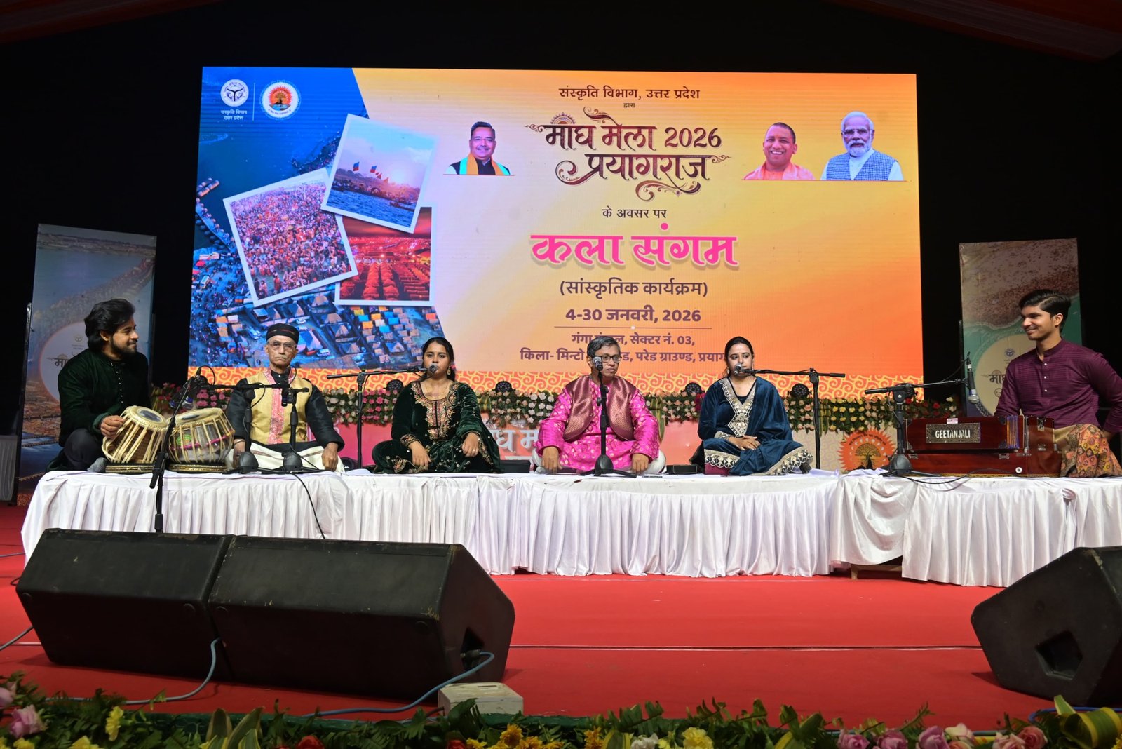 प्रयागराज। श्रद्धालूओं, सनातनियों एवं विभिन्न संस्कृतियों के संगम का स्थल माघ मेला 2026 प्रयागराज परेड ग्राउंड सेक्टर 3 स्थित संस्कृति विभाग उत्तर प्रदेश की ओर से कला संगम के आयोजन में आज वाराणसी के प्रख्यात कलाकार देवाशीष डे ने शास्त्रीय संगीत की तान “नीलिमा लालिमा, कहुं श्वेता कहुं वेता”, “शिव की जटा में देखिए, क्या क्या बहार है” जिसे श्रोतागणों ने पूरी तन्मयता से सुना और सराहा। उपरांत इसके दूसरी प्रस्तुति डाक्टर शिवानी, प्रतापगढ़ की प्रसिद्ध भजन गायिका ने गंगा/यमुना मैय्या की महिमा गान करते हुए बहुत सुंदर भजन गाये “दौड़त कि आवें जहां दुनिया बदली, बहुतै नीक लागे संगम की नगरी”, “गंगा द्वारे बधइया बाजे, मैय्या के तीरे तीरथ बसत है….” अपने सुमधुर भजनों से श्रोतागणों के कानों में रस घोलती रहीं। सलटू राम व टीम द्वारा गाजीपुर का धूमिया लोकनृत्य का ह्रदय को स्पर्श करने वाला प्रदर्शन किया। मथुरा से आये ब्रज के लोक गीत कलाकार कपिल शर्मा ने अपनी तान से जनता का दिल जीत लिया। “गोपी बनकर शंकर आये, महारास के दर्शन पाये, मनमोहन के मन को भाये…..” का मधुर संगीत प्रस्तुत किया। लोक नृत्य नाटिका की प्रख्यात कलाकार सोनाली चक्रवर्ती व टीम प्रयागराज ने “राम मय हनुमान” लोक नृत्य नाटिका का सुन्दर मंचन कर दर्शकों का मन मोह लिया। तत्पश्चात आज के दिवस की सेलिब्रिटी कलाकार मधुमिता भटृचार्य व टीम जो वाराणसी से शास्त्रीय संगीत की प्रख्यात कलाकारा हैं ने राग यमन, विलाम्बर चाल, द्रुत ख्याल, तीन ताल व दादरा का मन मोहने वाला राग पेश किया साथ ही सुन्दर भजन को गाकर श्रोताओं को सम्मोहित कर दिया। उद्घोषिका शांभवी शुक्ला ने मंच का सुन्दर संचालन कर जनता को बांधे रखा। सभी कलाकारों व टीमों को नोडल अधिकारी सुभाष चन्द्र व गुलाम सरवर द्वारा अंगवस्त्र व प्रमाण पत्र देकर सम्मानित किया गया।