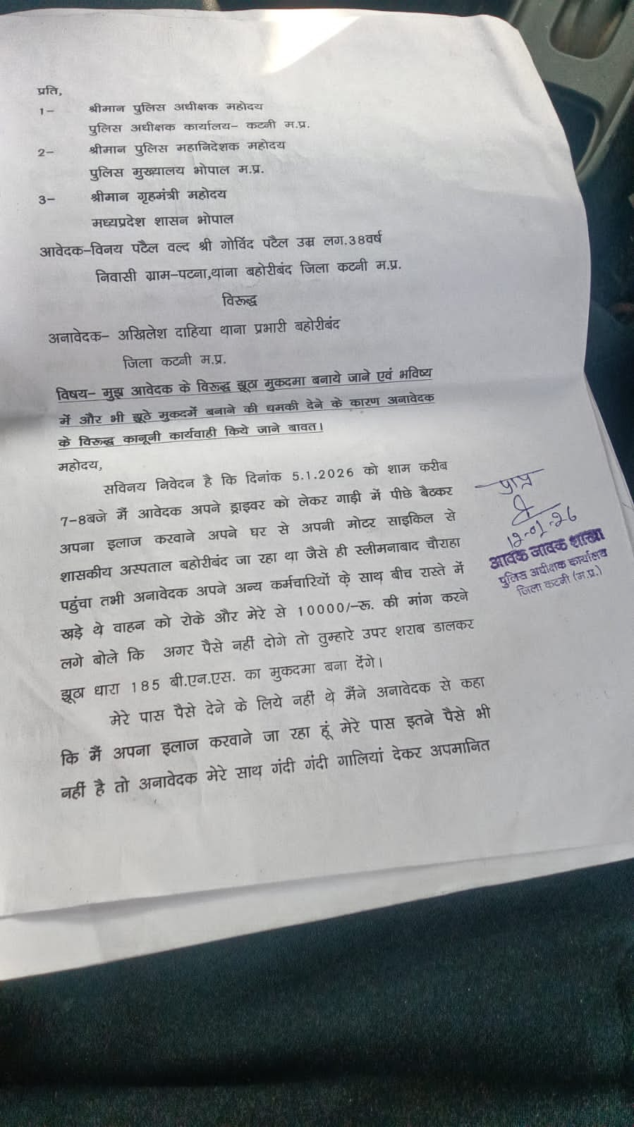 शिकायतकर्ता विनय पटेल की शिकायत अनुसार दिनांक 5.1.2026 को शाम करीब 7-8 बजे में आवेदक अपने ड्राइवर को लेकर गाड़ी में पीछे बैठकर अपना इलाज करवाने अपने घर से अपनी मोटर साइकिल से शासकीय अस्पताल बहोरीबंद जा रहा था जैसे ही स्लीमनाबाद रोड चौराहा पहुंचा तभी थाना प्रभारी अपने अन्य कर्मचारियों के साथ बीच रास्ते में वाहन को रोके और मेरे से 10000/-रू. की मांग करने लगे बोले कि अगर पैसे नहीं दोगे तो तुम्हारे उपर शराब डालकर झूठा धारा 185 बी.एन.एस. का मुकदमा बना देंगे।मेरे पास पैसे देने के लिये नहीं थे मैंने अनावेदक से कहा कि मैं अपना इलाज करवाने जा रहा हूं मेरे पास इतने पैसे भी नहीं है तो अनावेदक मेरे साथ गंदी गंदी गालियां देकर अपमानित
