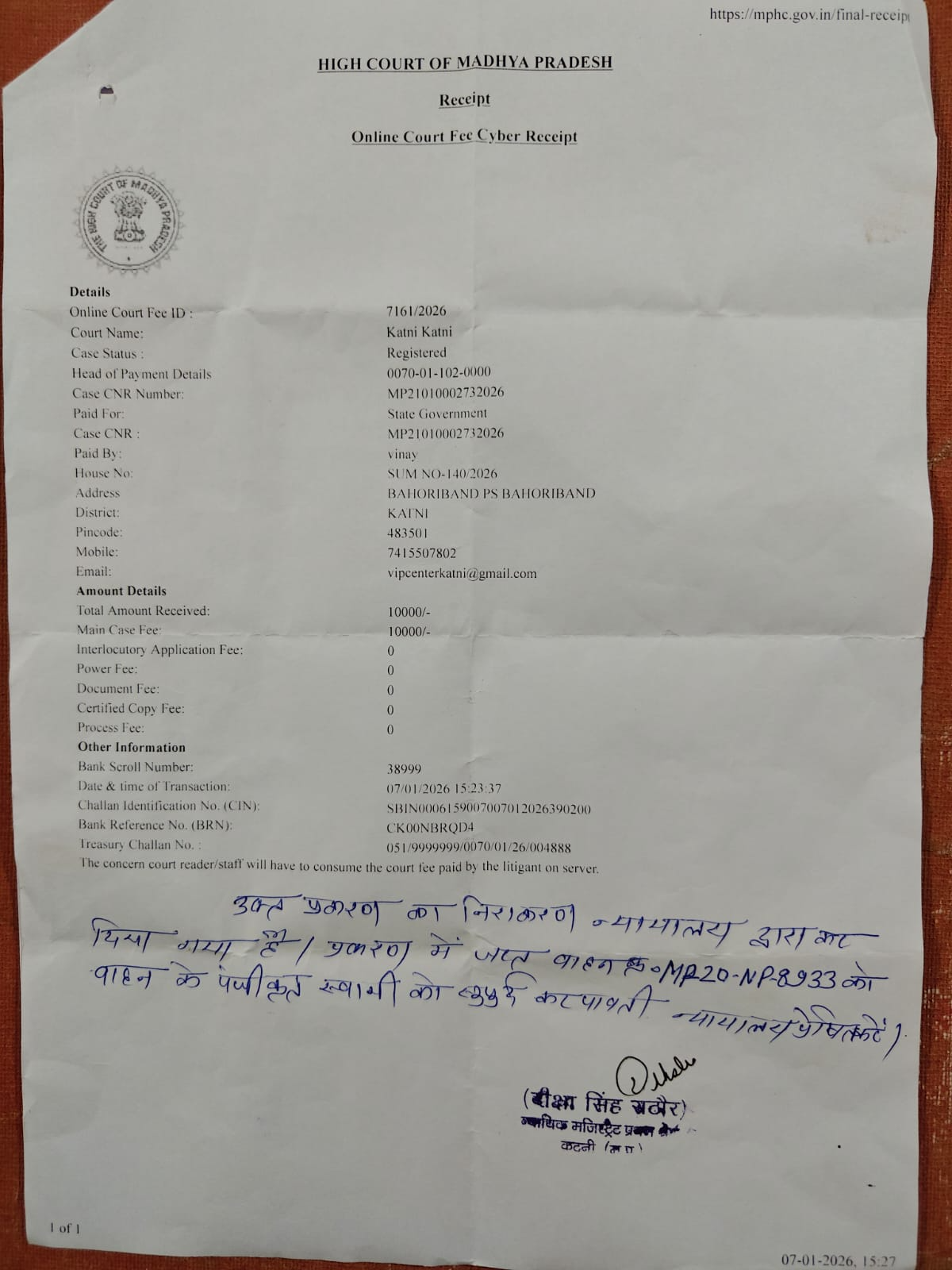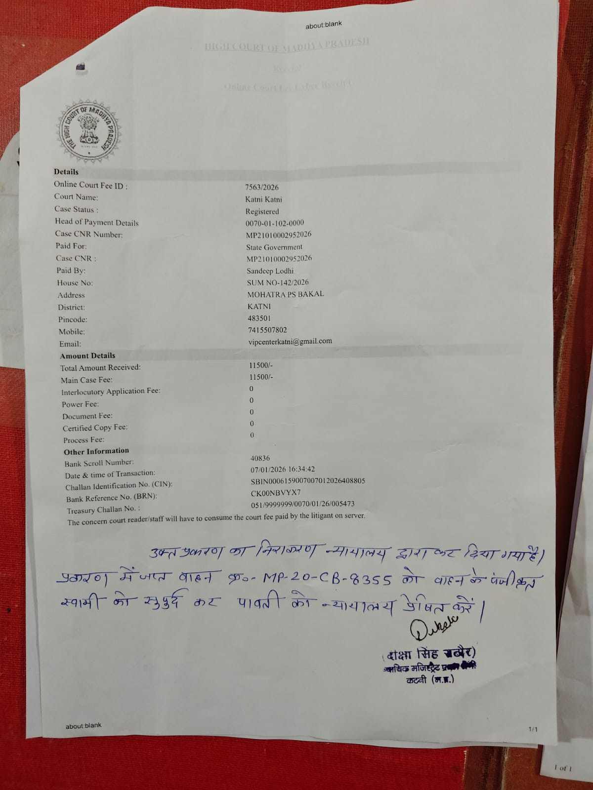 इसी प्रकार दिनांक 05.01.2026 को वाहन चेकिंग के दौरान विनय कुमार पटेल शराब पीकर मोटरसाइकिल चलते पाए गए तो पुलिस ने 185 एमबी एक्ट के तहत कार्रवाई करते हुए मोटरसाइकिल को जप्त किया गया और कार्यवाही कर इसतगाश कटनी न्यायालय के समक्ष पेश किया था जिसमें कटनी न्यायालय द्वारा दिनांक 07/01/26 को 10000 रू का जुर्माना किया गया,