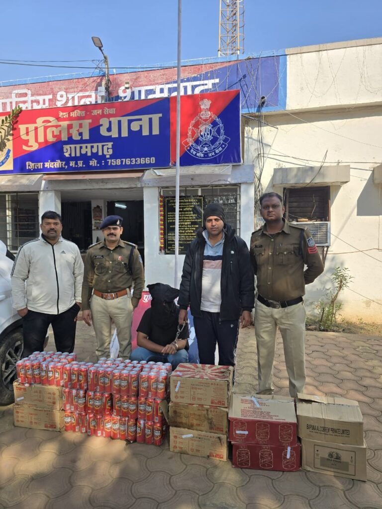 दिनांक 12.01.2026 को मुखबीर से प्राप्त सूचना पर कार्यवाही करते हुए कुंडला से बघुनियां तरफ जाने वाले कच्चे रास्ते पर घेराबंदी कर सफेद रंग की वेन्यु कार क्रमांक MP 13 ZK 6809 के चालक कमल सिंह पिता रामसिंह सौ.राज. उम्र 22 साल निवासी ग्राम सेमलीरुपा थाना गरोठ जिला मन्दसौर को पकडा जिसकी तलाशी लेने पर कार मे अवैध शराब की पेटीया भरी होना पायी गयी जो मौके पर शामगढ पुलिस द्वारा कार्यवाही करते हुए कमल सिहं के कब्जे वाली कार से अंग्रेजी शराब तथा बीयर की कुल 22 पेटी जब्त की जो अवैध शराब की कुल मात्रा 322 बल्क लीटर कीमती 107856 रुपये की होना पायी गई जो आरोपी कमल सिंह पिता रामसिंह सौ.राज. निवासी ग्राम सेमलीरुपा थाना गरोठ जिला मन्दसौर को गिरफ्तार किया गया आरोपी कमल सिहं से पूछताछ करते उक्त शराब संग्राम सिहं पिता सौदानसिंह सौ.राज. निवासी छायन के द्वारा देना बताया तथा उक्त कार भी संग्रामसिंह के नाम पर दर्ज होना पाई गई जो आरोपी कमल सिहं पिता राम सिहं सौधिया निवासी सेमलीरूपा थाना गरोठ व संग्राम सिहं पिता सौदान सिहं सौधिया राजपुत निवासी छायन थाना शामगढ के विरूद्ध अपराध धारा 34(2) आबकारी एक्ट का थाना शामगढ पर पंजीबद्ध किया जाकर विवेचना मे लिया गया ।