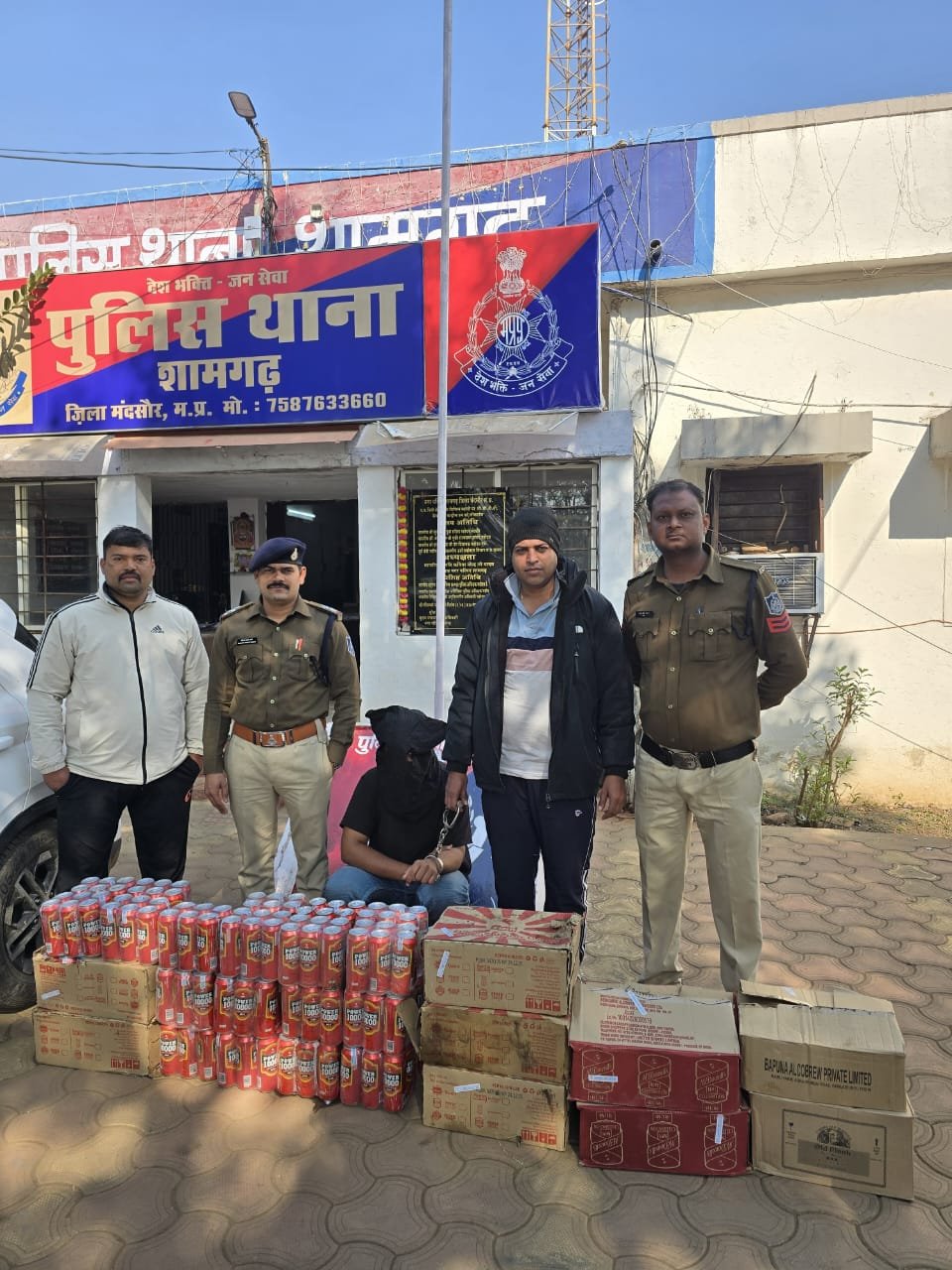 श्रीमान पुलिस अधीक्षक महोदय मंदसौर श्री विनोद कुमार मीणा के द्वारा अवैध शराब माफियाओं के विरुद्ध प्रभावी कार्रवाई के निर्देशन एवं श्रीमती हेमलता कुरील अतिरिक्त पुलिस अधीक्षक महोदय (गरोठ) एवं श्री दिनेश प्रजापति एसडीओपी सीतामऊ के मार्गदर्शन मे थाना प्रभारी शामगढ उप निरीक्षक कपिल सौराष्ट्रीय की टीम ने कुण्डला बुजुर्ग से भुण्डिया जाने के कच्चे रास्ते से आरोपी कमल सिहं पिता राम सिहं सौधिया राजपुत निवासी सेमली रूपा के कब्जे वाली ह्युण्डई कंपनी की वेन्यु कार जिसका रजिस्ट्रेशन नंबर MP 13 ZK 6809 से अवैध अंग्रेजी शराब कुल 322 लीटर जप्त करने में सफलता हासिल की ।