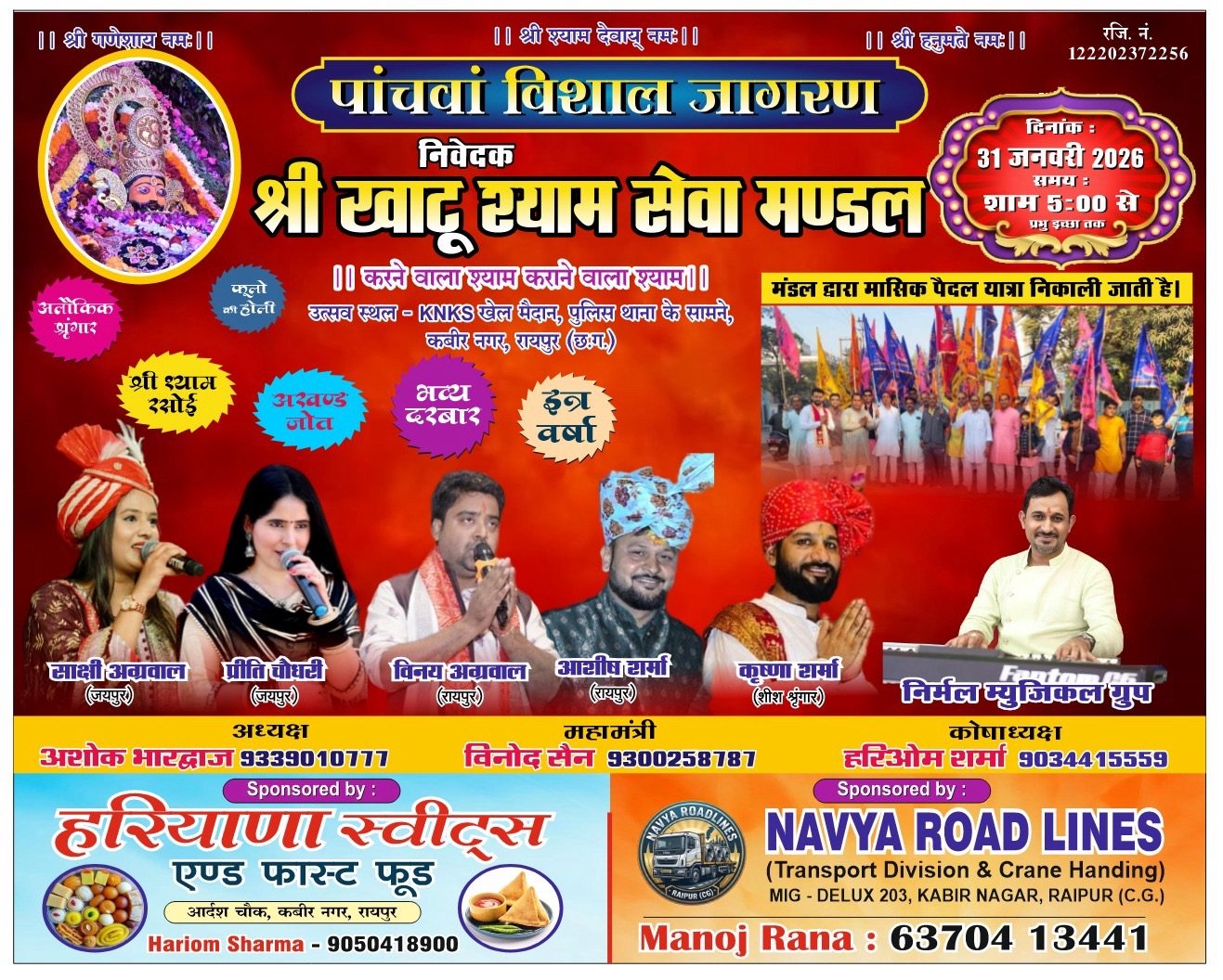 भव्य झांकियों और प्रसिद्ध कलाकारों के साथ विशाल श्याम जागरण होगा। श्याम नाम की गूंज से गूंजेगा रायपुर!