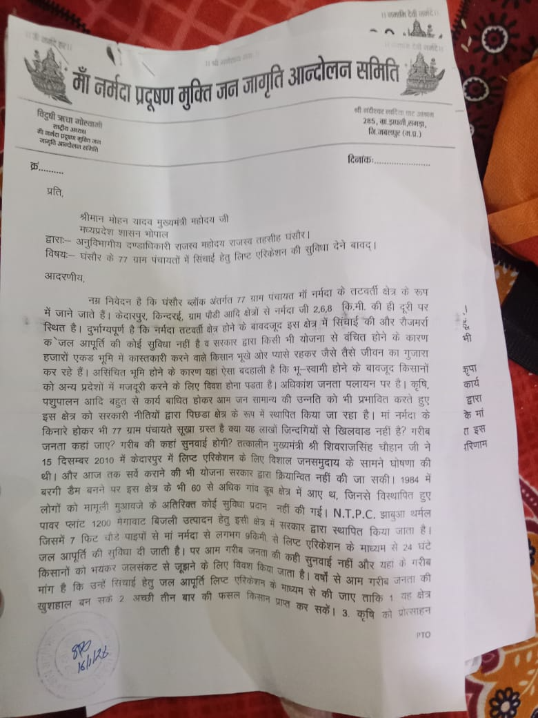 मुख्यमंत्री श्री शिवराज सिंह चौहान में केदारपुर के हाई स्कूल ग्राउंड में घोषणा की थी की मैं बरगी डैम के ऊपर से आ रहा हूं वहां जल्द ही जल भरा है हम आपके क्षेत्र को जल्द ही सर्वे का बजट पारित कर सर्वे करा कर लिफ्ट इरीगेशन से 30 साल पुरानी मांग को पूरे करेंगे और उन्होंने अभी तक घंसौर क्षेत्र के 246 ग्रामों में जल आपूर्ति नहीं की जिससे लोग बड़ी मात्रा में पलायन हो जाते है यह क्षेत्र पूरा आदिवासी क्षेत्र है और लोगों के पास 5 से 10 एकड़ की भूमि सिंचाई की अभाव में अपनी तीनों फसल नहीं ले पाते एवं किसानों को अपनी लागत का दोगुना मूल भी नहीं मिल पाता इसलिए लोग मजदूरी करने बाहर चले जाते हैं और कुछ लोग बेरोजगार घूमते हैं इन्हीं सब समस्याओं से सिंघानपुरी पाटन से केदारपुर पौड़ी को ही होते हुए मैं घंसौर पहुंची लोगों से जगह-जगह मिली जानकारी में पाया कि क्यों ना इस क्षेत्र के लिए सबसे बड़ा धर्म का काम किया जाए किसान यदि संपन्न होगा तो धर्म कर्म में और अच्छे से भागीदारी ले पाएगा खेतों में किसानों को पानी पहुंचने में मदद करना भी बहुत बड़ा धर्म का काम है अतः हमारे सभी हिंदू सनातनी आर्थिक रूप से उन्नत बनेंगे तो भी धर्म की रक्षा अच्छे से कर पाएंगे इन्हीं सब विचारों को मैंने आज ज्ञापन के माध्यम से यहां की जनपद अध्यक्ष और अन्य प्रतिनिधियों से यापन दिलवाया और सरकार को 24 घंटे का समय मेरे ज्ञापन पत्र में दिया गया है शासन ने 24 घंटे के अंदर बजट प्रस्ताव पारित नहीं किया तो मैं 18 जनवरी से जनपद के सामने धार्मिक अनुष्ठान करते हुए धरना प्रदर्शन करूंगी जो विज्ञापन पत्र में दे दिया गया है और इसकी सारी जिम्मेदारी शासन प्रशासन की होगी