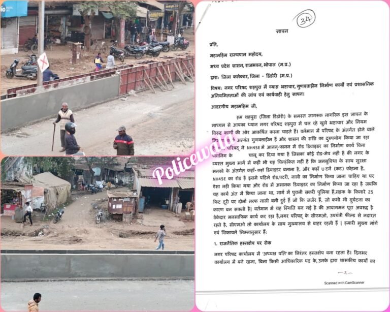 नगर परिषद शहपुरा में चल रहे निर्माण कार्यों को लेकर एक बार फिर गंभीर सवाल खड़े हो गए हैं। NH-45E मुख्य मार्ग पर बनाए जा रहे डिवाइडर निर्माण में खुलेआम भ्रष्टाचार, मनमानी और भारी तकनीकी अनियमितताओं के आरोप सामने आए हैं। नगर के जागरूक नागरिकों ने मध्यप्रदेश के राज्यपाल के नाम जिला कलेक्टर के माध्यम से ज्ञापन सौंपते हुए मामले की उच्च स्तरीय तकनीकी जांच और दोषियों पर सख्त कार्रवाई की मांग की है।