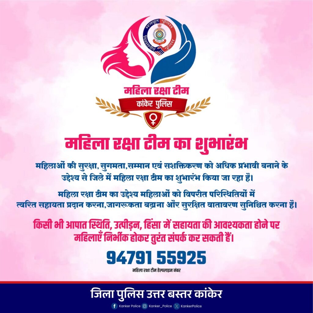 महिलाओं की सुरक्षा और सशक्तिकरण को प्राथमिकता देते हुए पुलिस अधीक्षक श्री निखिल अशोक राखेचा (भापुसे) के निर्देश पर जिले में “महिला रक्षा टीम” का शुभारंभ किया गया। इस विशेष टीम का उद्देश्य महिलाओं के विरुद्ध अपराधों की रोकथाम और उन्हें सुरक्षित वातावरण प्रदान करना है।
