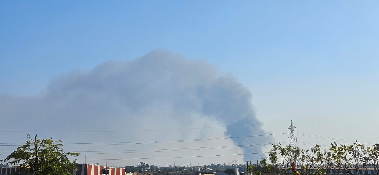 रायपुर | राजधानी के प्रमुख औद्योगिक क्षेत्र उरला स्थित कावेरी इंडस्ट्रीज की तार फैक्ट्री में शनिवार दोपहर एक भीषण अग्निकांड हो गया। दोपहर लगभग 1:00 बजे लगी इस आग ने देखते ही देखते विकराल रूप धारण कर लिया, जिसकी भयावहता का अंदाजा इसी बात से लगाया जा सकता है कि धुएं का काला गुब्बार 22 किलोमीटर दूर से भी स्पष्ट दिखाई दे रहा था।